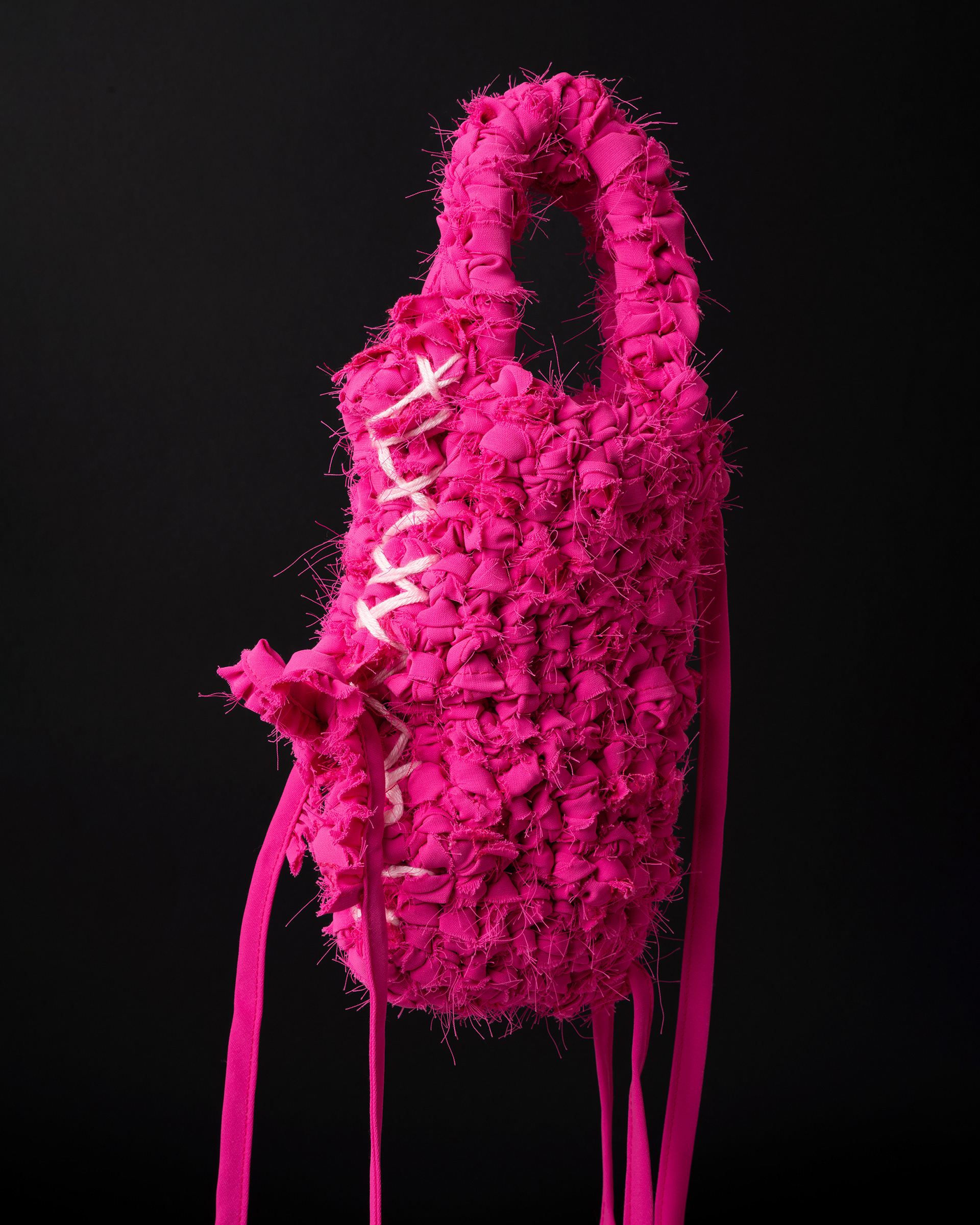 When my friend Mia asked me to shoot her bag collection, I knew this wasn't going to be a typical product shoot. Each piece she makes is one-of-a-kind, these are hand-crafted mini bags built entirely from shredded and repurposed fabric scraps. No two are alike, and that's exactly the challenge: how do you photograph something that's equal parts fashion accessory and textile sculpture?