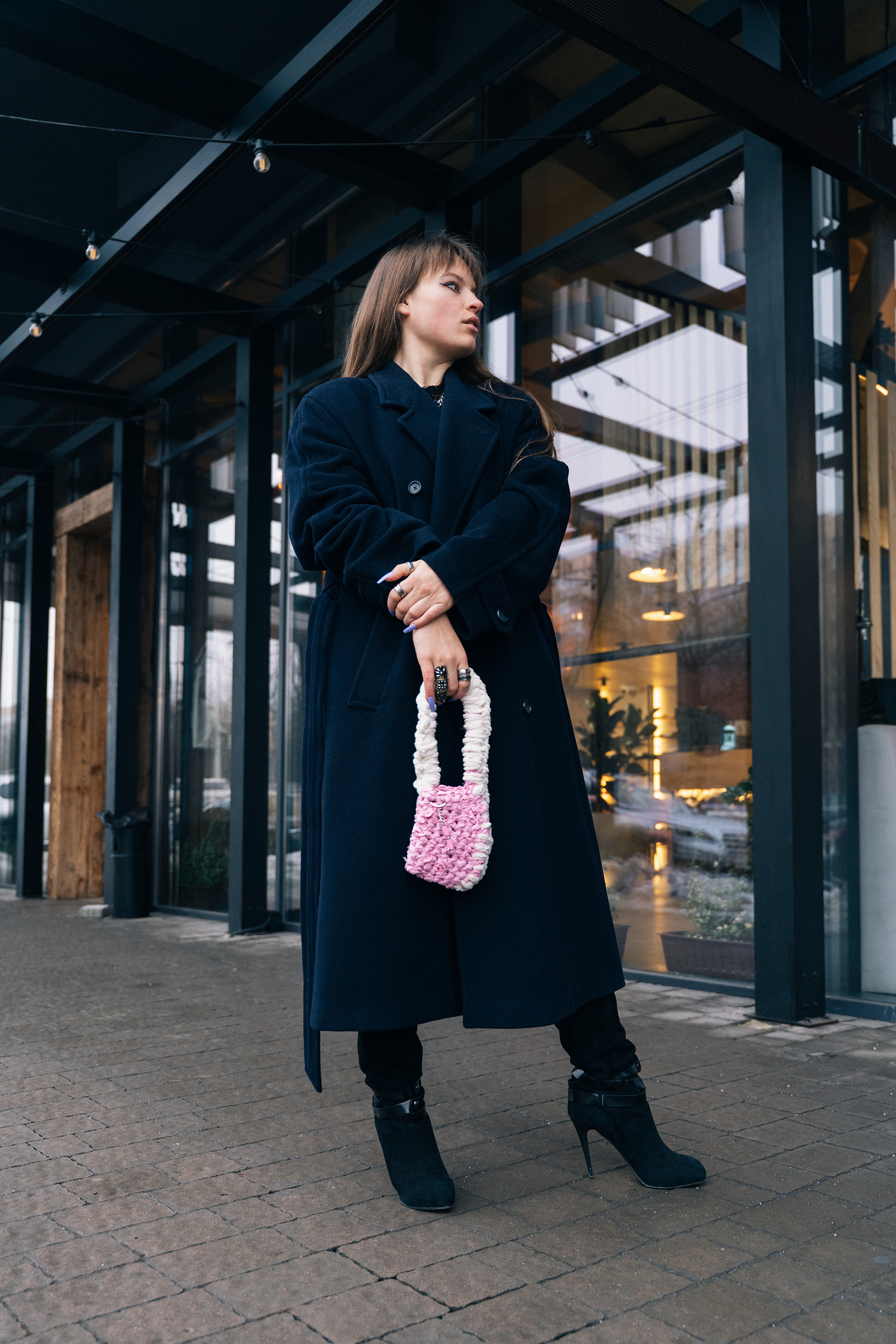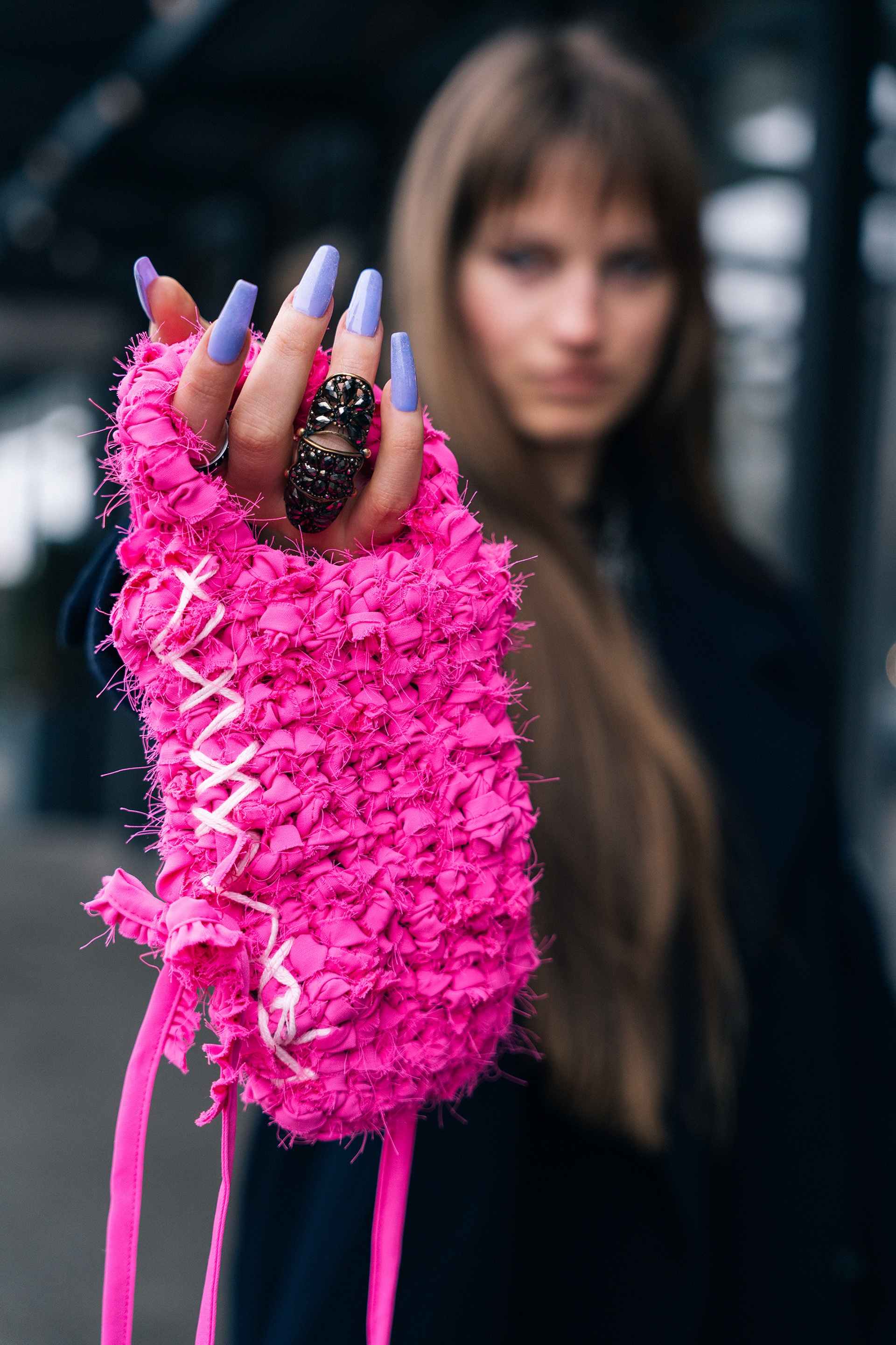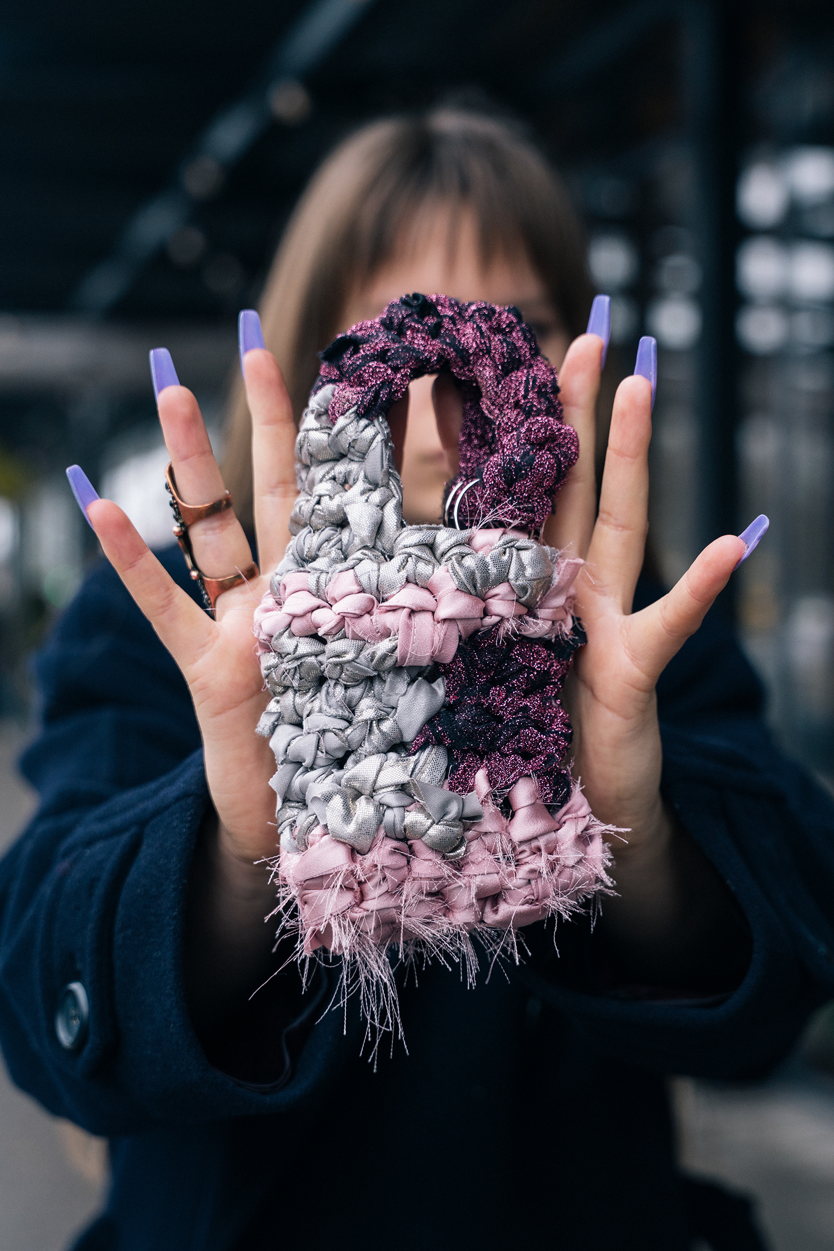 We split the project into two directions. For the studio work, I wanted the bags to feel almost like art objects - floating against a deep black background, lit in a way that brought out every knot, fray, and layer of fabric. These pieces have insane texture, so the lighting had to work hard to make you want to reach through the screen and touch them. For the lifestyle side, we took to the streets on a grey winter day in the city, which ended up being the perfect contrast, that moody, overcast light against her bold, tactile designs just worked.