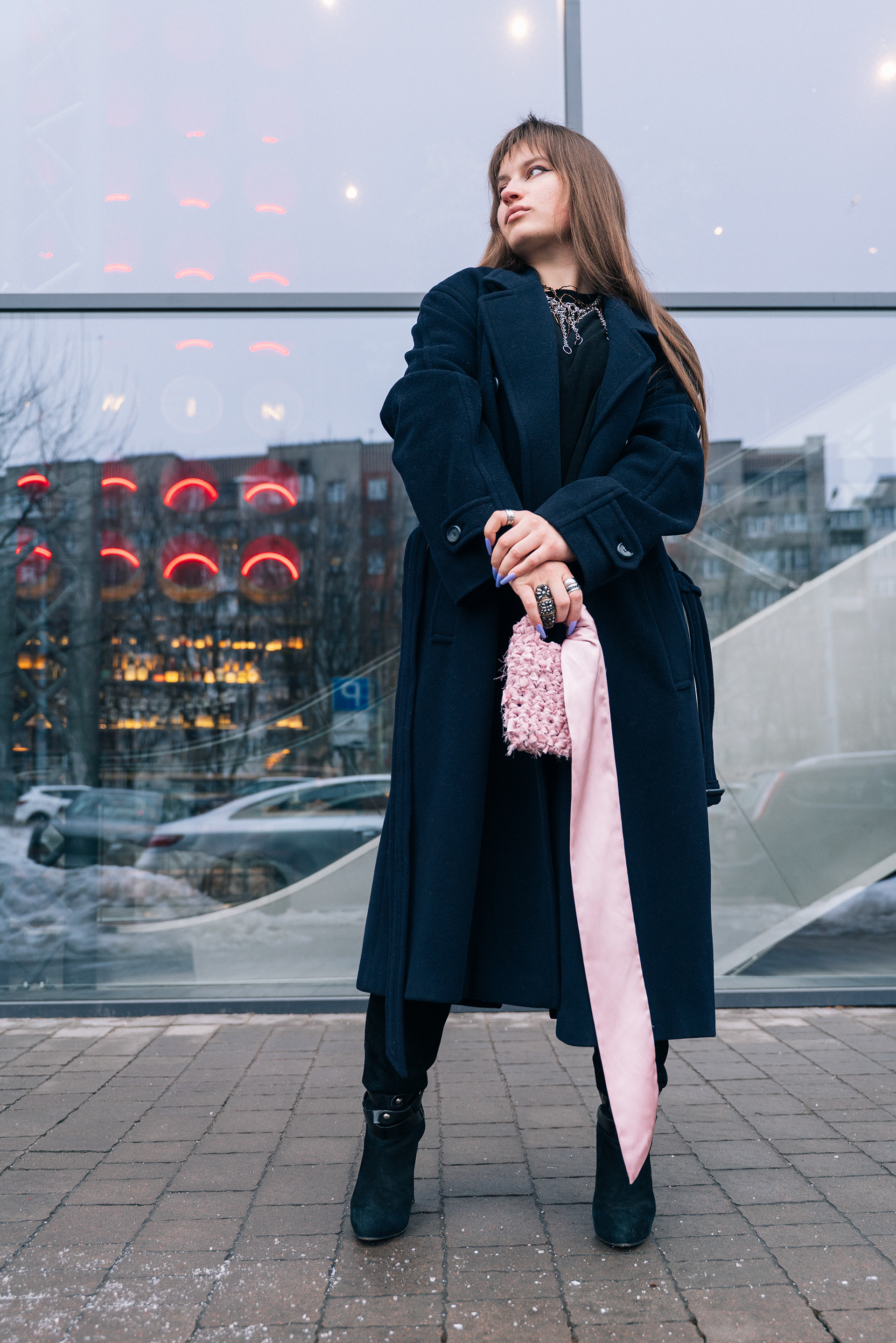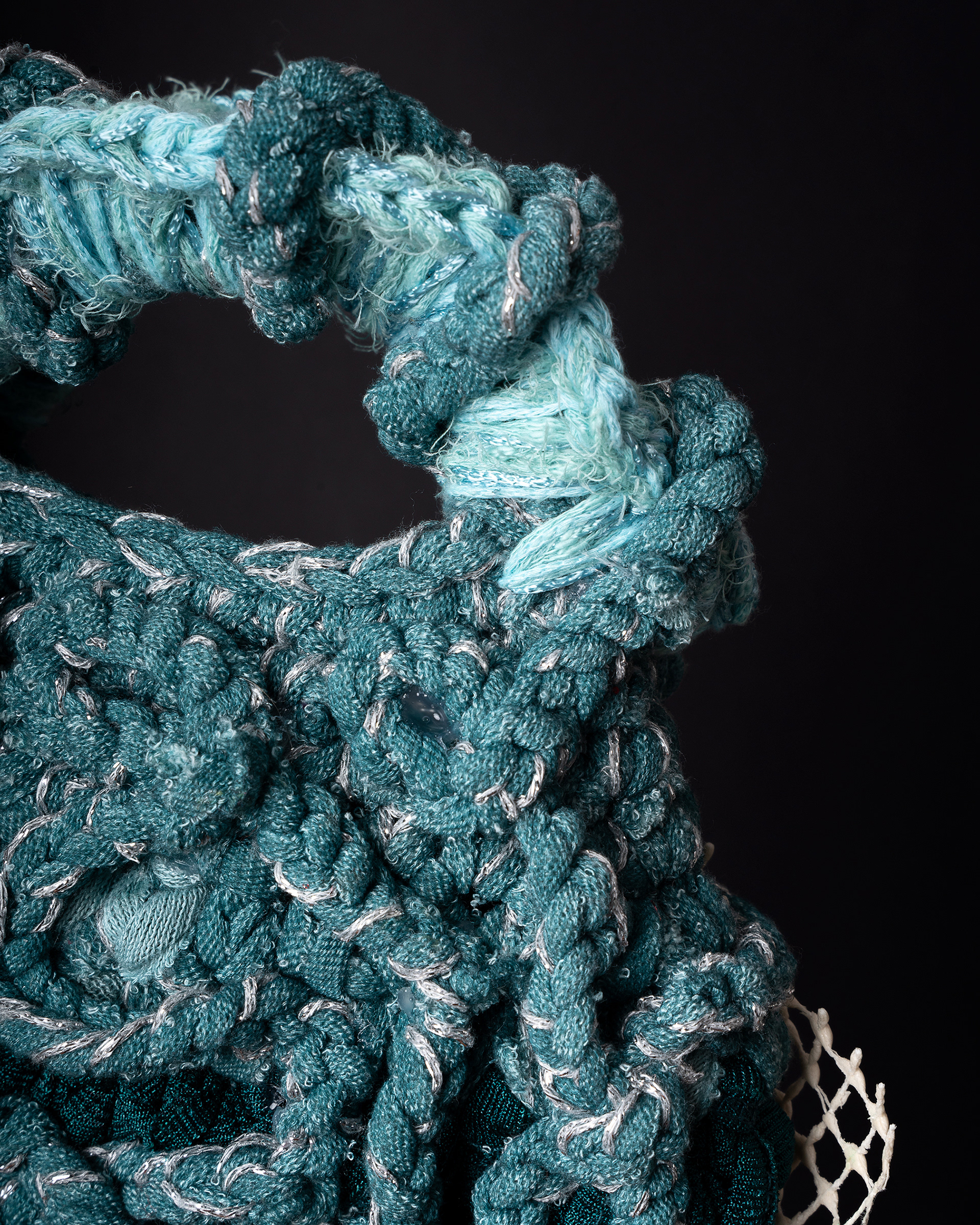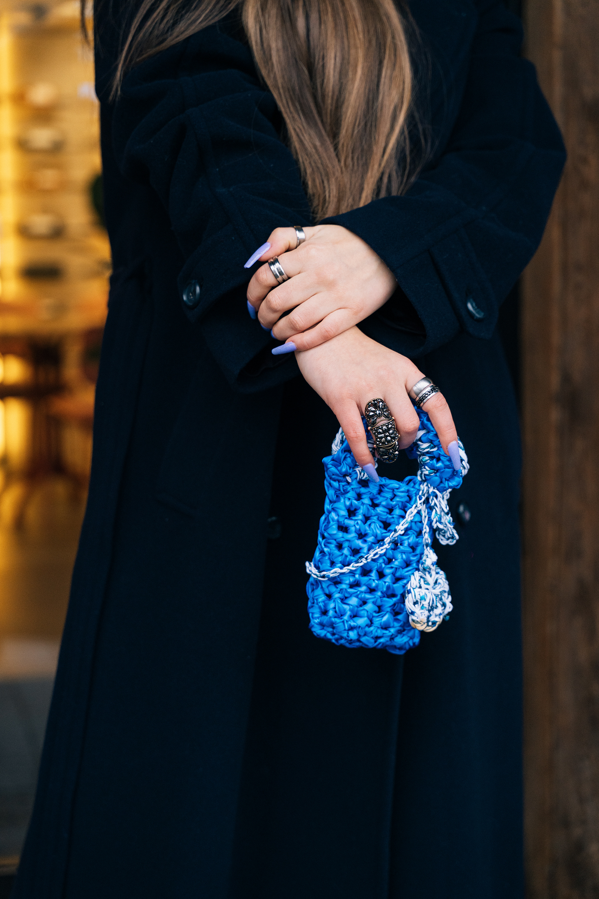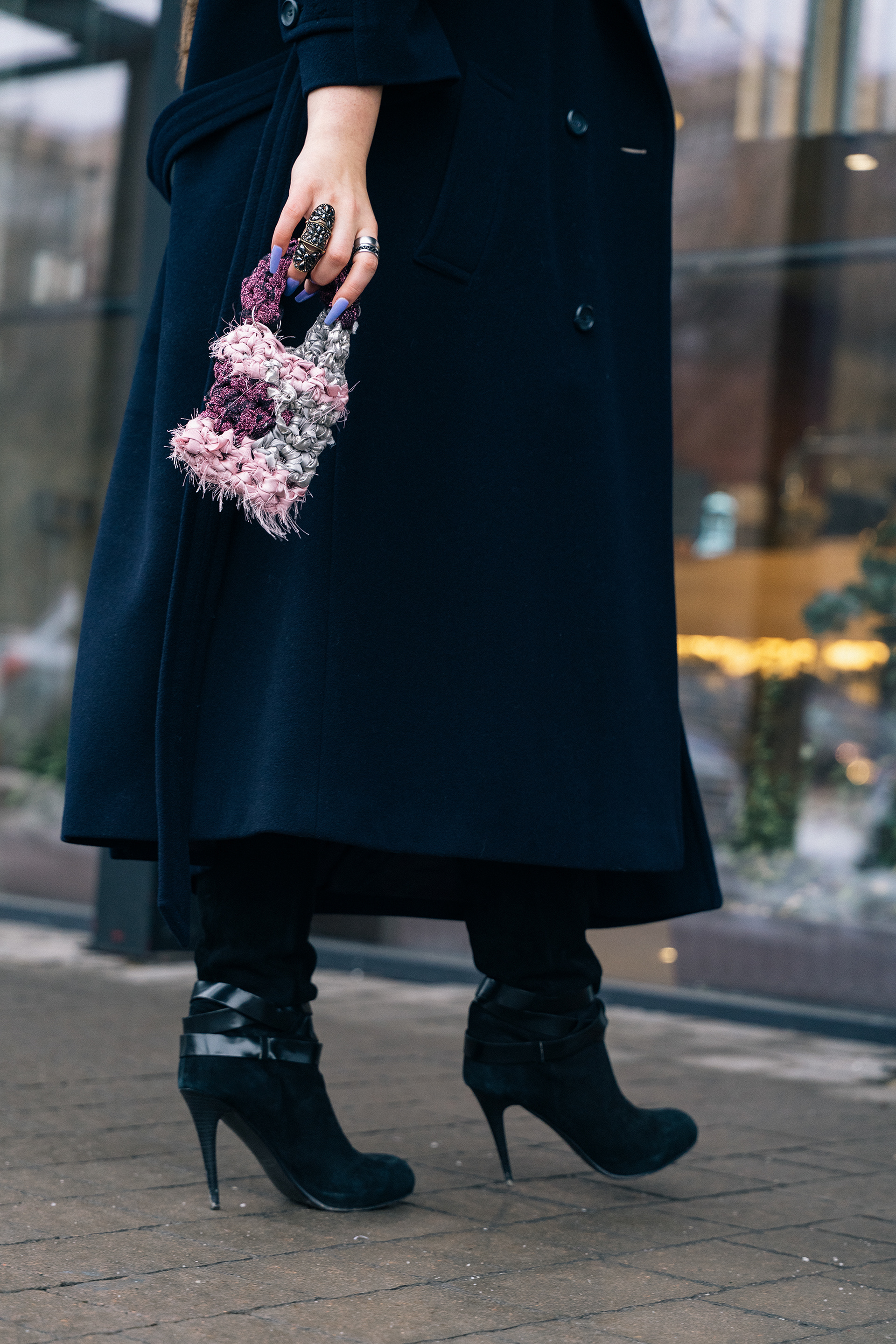 We split the project into two directions. For the studio work, I wanted the bags to feel almost like art objects - floating against a deep black background, lit in a way that brought out every knot, fray, and layer of fabric. These pieces have insane texture, so the lighting had to work hard to make you want to reach through the screen and touch them. For the lifestyle side, we took to the streets on a grey winter day in the city, which ended up being the perfect contrast, that moody, overcast light against her bold, tactile designs just worked.